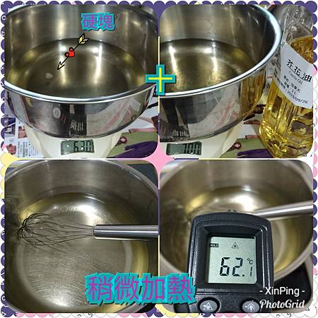 2.先隔水加熱椰子油溶化成液狀(椰子油硬邦邦的...,都倒不出來),稍微溶解後我直接把椰子油630倒入不鏽鋼鍋內再倒入芥花油70g,天冷,再稍稍加熱一下混合