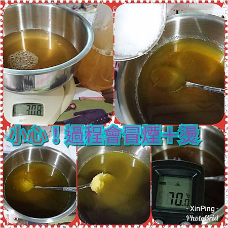 4.將氫氧化鈉倒入檸檬香茅水308g內,分幾次倒每倒一些就攪一下直到氫氧化鈉都倒完,一直攪拌到氫氧化鈉完全溶解,這次用的是檸檬香茅冰水,所以過程會有煙及高溫,要戴上護目鏡及口罩,溶解後的鹼水溫度約70℃,會燙要小心