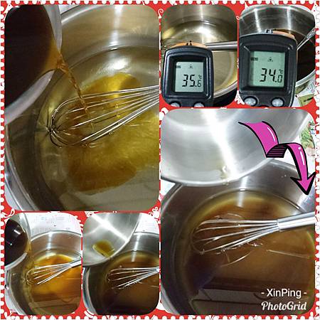 5.氫氧化鈉完全溶解後溫度與油溫皆在35℃左右便可將兩者混合,量測油溫35.6℃和鹼液溫度34.0℃,兩者溫差沒超過5℃就可以混合,將氫氧化鈉溶液倒入油中,邊倒邊攪拌充份混合,倒完後鍋底很乾淨無殘留氫氧化納