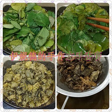 2.因油炸左手香一定會耗損油,但打算用杏桃核仁油補足橄欖油炸左手香後不足的油量(這次的左手香晾乾後的重量約210g),所以我只倒入橄欖油135g並沒有多倒,低溫慢炸左手香葉直到變黃變酥即可(小火歐),過濾掉炸乾的左手香葉,自製的"左手香風味橄欖油"完成