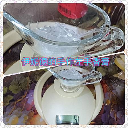 5.加入薄荷腦5g,我這次薄荷腦放得比較少(其實本來想倒3g),因為等一下要放的複方精油會含有機胡椒薄荷精油3g,最近一直冷,連續冷了一星期,室溫約9℃,怕還沒倒入全部罐子就結涷了,所以我在熱熱時就給它倒入精油,攪拌一下(胡椒薄荷又名歐薄荷,歐薄荷會退奶,所以哺乳媽媽不建議使用 )
