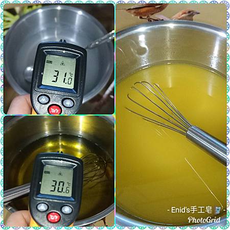量測氫氧化鈉溶液和油的溫度,35℃左右且兩者溫差不超過5℃就可以混合