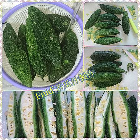 將山苦瓜洗淨,去除蒂頭後對切,方便投入慢磨機內