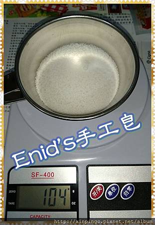 2.準備氫氧化鈉104g,手工皂使用的氫氧化鈉PH值約12,溶鹼時要非常小心,避免碰到皮膚尢其眼睛