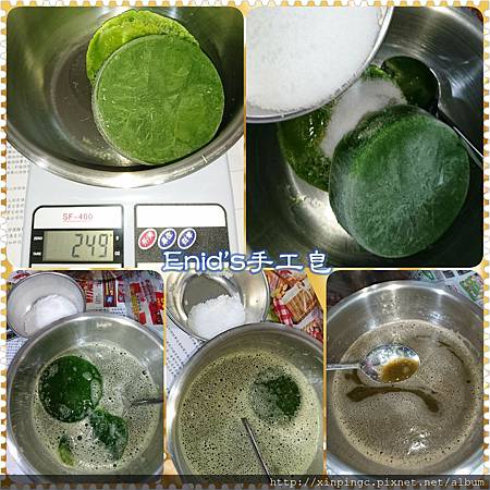 3.準備山苦瓜原汁冰塊249g,將氫氧化鈉邊倒邊攪分次倒入,因為綠色的苦瓜汁無法用肉眼看有沒有殘留,只能用湯匙反覆攪拌確認鍋底有沒有硬硬的感覺,保險起見我大約攪一攪停一停約60分鐘