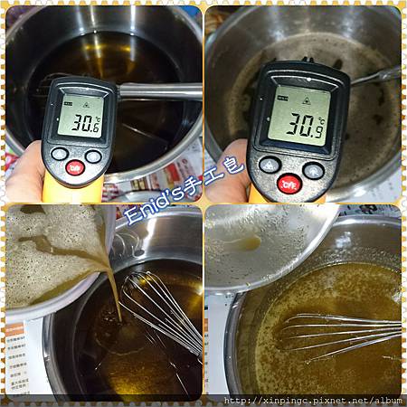 4.量測溫度:鹼液(30.9℃)和油溫(30.6℃),伊妮習慣控制在5℃內混合,將鹼液倒入油中,邊倒邊攪拌充份混合,因為是山苦瓜原汁,所以鹼液內有些山苦瓜的細渣,因為有渣所以也不用額外再加山苦瓜粉了,天然的尚好,原汁原味