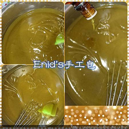 5.開始攪拌沒多久就勾勾了,隨便就能畫出8,倒入有機胡椒薄荷精油+廣藿香精油+甜橙精油再攪拌一下