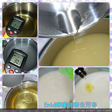 邊倒邊攪拌,充份混合,打到略微濃稠trace後,加入檸檬&甜橙精油,再攪拌一下,讓精油和皂液混合均勻