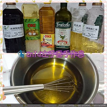 把每種品項的油量測好倒入不鏽鋼鍋內混合(硬油要先隔水加熱溶解再混入),椰子油/棕櫚油沒有凝固的很嚴重,所以我就全部先混合在一起後稍微加熱
