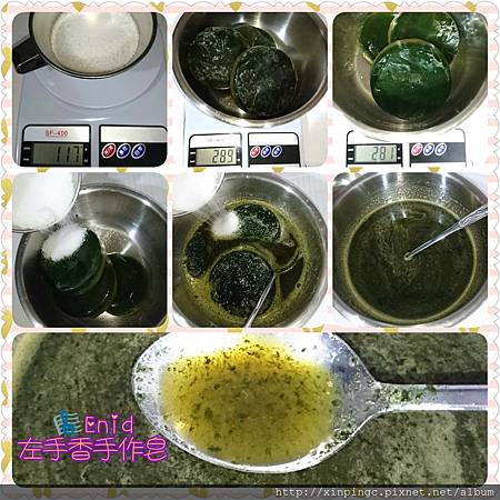 將氫氧化鈉117g倒入左手香原汁冰塊281g內,每倒一些就攪一下直到氫氧化鈉都倒完,因為鹼液綠綠的,看不出來是否己完全溶解,但因為左手香的渣渣是軟的,一直攪拌到沒有顆粒的感覺,就表示氫氧化鈉都溶解了,左手香原汁冰塊倒入時有點超重到289g,所以拿去沖一下水讓重量符合到281g,沖水後看起來油綠油綠的