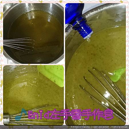 4.攪拌需要些時間,打到略微稠到可以畫出痕跡,加入埃及天竺葵/苦橙葉/迷迭香精油,再攪拌一下讓精油和皂液混合均勻