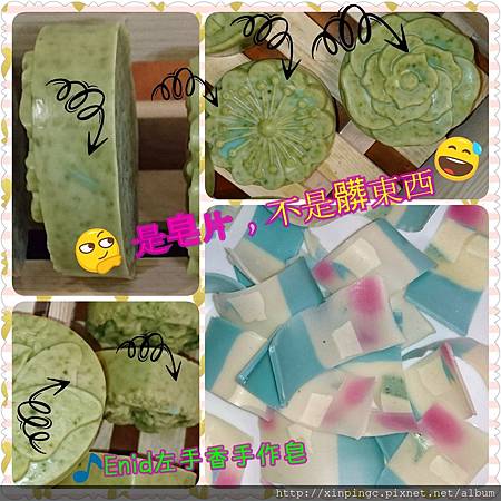 脫模後發現皂片埋過頭了,部份皂片在表面藍藍的,粉粉的,這綠光皂頂.....嗯
