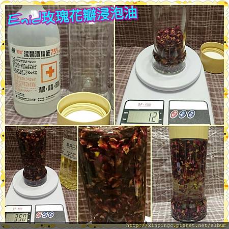 浸泡油這次也是泡的很隨性,就像在泡花茶一樣用裸視目測即可,我是以有泡到油為比例來製作的,把玫瑰花瓣放到瓶子內約1/3~1/2 的高度(12g),讓油(350g)可以蓋得住玫瑰花瓣,花瓣都有泡到油就好了,玫瑰花瓣己經一片一片了,有助成分溶出及浸泡,一下子就看到淡淡的顏色,這比紫草浸泡油賞心悅目多了,估算出來的重量比例是1:30