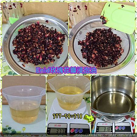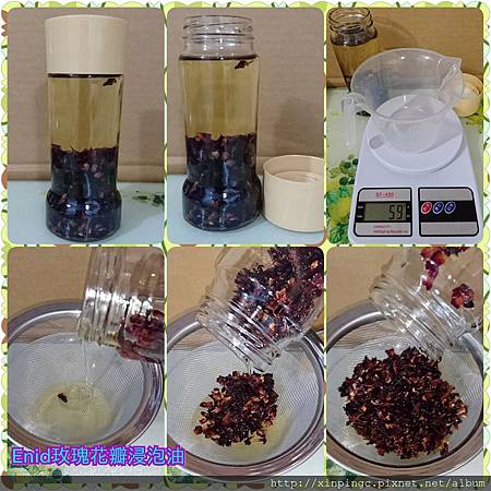 浸泡一段時間後,有些花草會褪色轉為暗色,這樣表示花草的能量養份己逐漸釋放到油裡,若想要加強版的浸泡油可以先將花草過濾出來,再放入一份花草後,一直重複這樣的動作,這瓶浸泡油的能量香味應該就會很強吧,但因為耗油所以若想要重複在一開始時油要放多些,玫瑰浸泡油含維他命A、C、E,可保濕使皮膚看起來紅潤。浸泡油有氧化酸敗的風險,自己泡是比較放心的,甜杏仁油較不易保存,雖然這一瓶也是剛買的,但預計放置一個月,要拿來作玫瑰皂,替皂添加些顏色,如果有作膏類也可以放一些