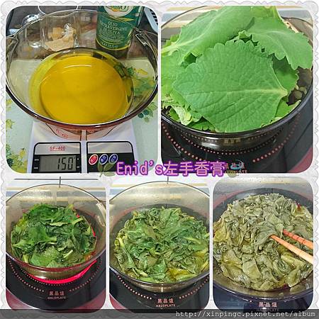 2.油炸左手香會耗損油,這次的左手香晾乾後的重量363g,與初榨橄欖油比例約為4:1,我倒入橄欖油150g(需要100g),小火慢炸左手香葉,耗油率的變異性在於炸的時間及左手香重量,我大約都抓35%~50%,不夠再補油就好,左手香葉很多,所以我倒入150g,至少可以讓葉子逐片的慢慢浸到油,慢火的油炸左手香