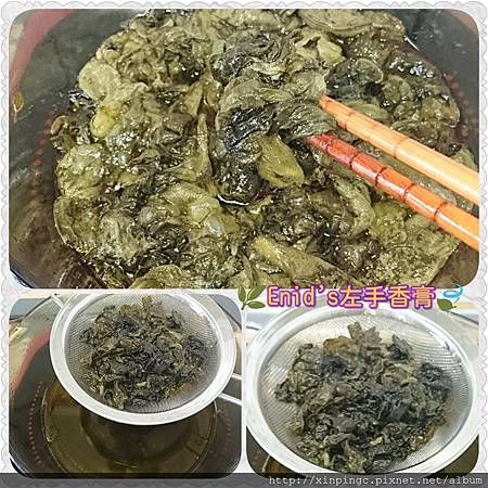 3.我花了約2小時燉這些葉片,過濾掉油燉後的左手香葉,左手香葉渣其實仍包覆著蠻厚的橄欖油,過濾左手香葉後我只取100g的油,鍋底剩一些油,很香