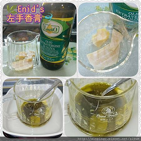 4.因為只有放天然蜂蠟25g,所以我就直接將蜂蠟倒入左手香橄欖油內,再一起隔水加熱融化
