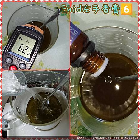 4.蜂蠟融化後,測一下溫度約70℃左右,倒入薄荷腦攪拌到溶化後,這溫度就降到約62℃,接著倒入有機茶樹精油2g&有機胡椒薄荷精油2g,再攪一攪混合均勻