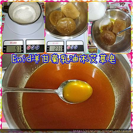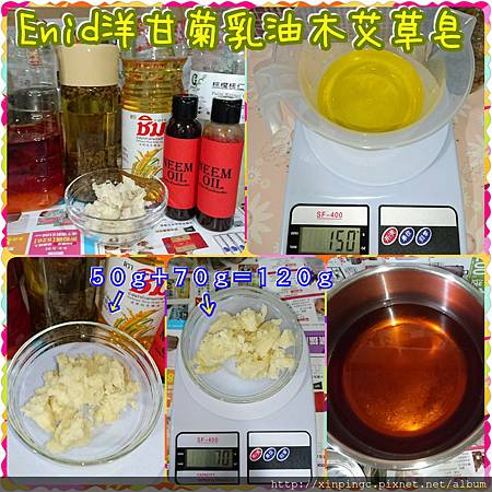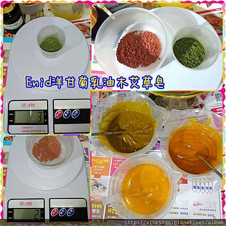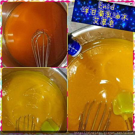 1.準備好需要的油脂後倒入不鏽鋼鍋內混合,這鍋艾草皂有搭配伊妮在5月份製作的洋甘菊杏桃核仁浸泡油150g,這洋甘菊在杏桃油裡被伊妮翻滾了3.9個月,看起來油亮油亮的,浸泡油己經有著濃濃的洋甘菊香氣,顏色帶點鵝黃色,伊妮先倒出需要的150g,乳油木果脂先隔水加熱後也一起倒入,這乳油木果脂原本計畫是50g,但因為天氣漸漸變涼了,伊妮臨時又增加70g,這個配方乳油木果脂120g