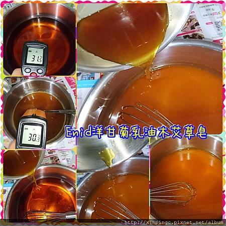 3.艾草鹼水完成後,量測油溫和鹼液的溫度,因伊妮習慣是低溫打皂,溫度都在35℃左右且溫差沒超過5℃就將艾草鹼液慢慢的倒入油脂內混合