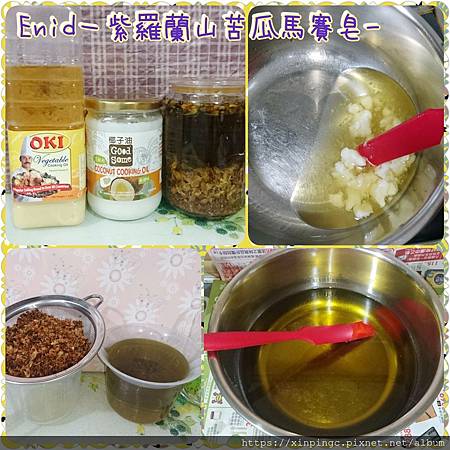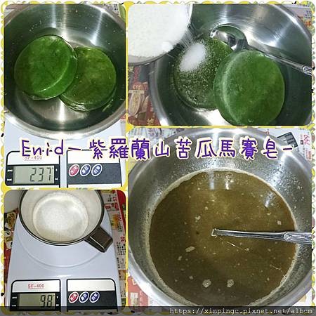 冷製皂使用的鹼是氫氧化鈉PH值約12,所以先戴上手套、護目鏡、口罩後,小心的將氫氧化鈉98g,分次小量的慢慢倒入237g山苦瓜慢磨原汁冰塊內,攪拌到氫氧化鈉完全溶解