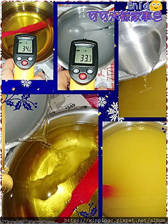 3.量測鹼液溫度與油溫皆在35℃左右,溫差也沒超過5℃,將鹼液倒入油脂中混合均勻,純水鹼液倒完後鍋底很乾淨無殘留氫氧化鈉