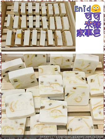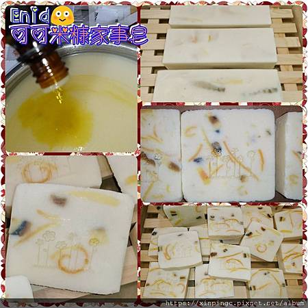 4.將皂液打到可以畫出痕跡後,接著倒入甜橙精油/佛手柑精油/檸檬精油並攪拌均勻,再放些皂片調個花樣,洗東西時視線才不會太單調,皂液倒入模後,大約5小時後脫模切皂+蓋個皂章