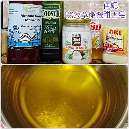把每種品項的油量測好倒入不鏽鋼鍋內混合,冷壓椰子油和棕櫚油要先隔水加熱融化後再一起混入
