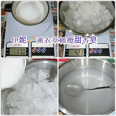 將氫氧化鈉170g分次倒入421g純水冰塊內,攪拌到氫氧化鈉完全溶解,手工皂使用的苛性鹼是氫氧化鈉PH值約12,溶鹼時要非常小心,手套/護目鏡/口罩一定要戴上