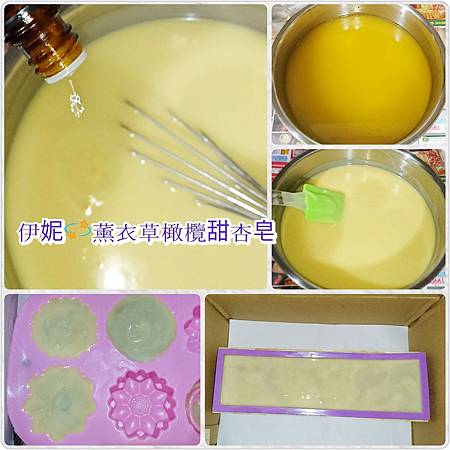 將皂液攪拌到勾勒出痕跡後,加入真正薰衣草精油/甜橙精油/玫瑰草精油,倒入後再攪拌一下,讓精油和皂液混合均勻,分杯後倒入薰衣草花瓣粉和澳洲藍礦石泥粉,也是攪拌均勻後,即可倒入到矽膠模裡