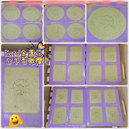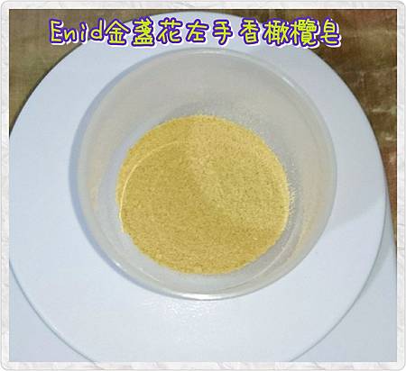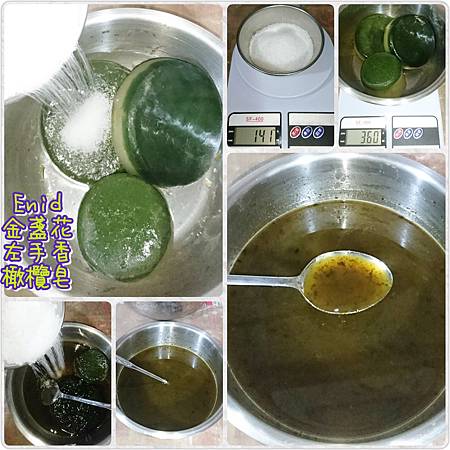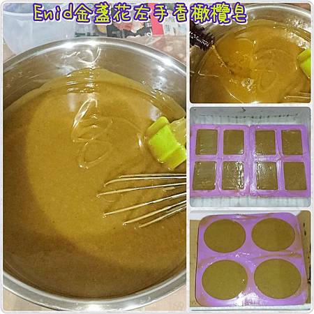 將左手香鹼液倒入油脂內,打到皂液可以勾勒出痕跡後,加入馬鞭草/歐薄荷/甜橙精油後攪拌讓精油和皂液混合均勻,攪拌均勻後分一小杯倒人金盞花瓣細粉5g,並與皂液混合均勻,將皂液倒入矽膠模裡,放進箱內保溫,避免皂化的時候太冷失溫