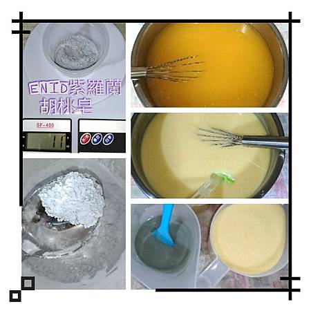 4.將鹼液倒入油脂內,攪拌到可以勾勒出痕跡,將皂液分一小杯倒入藍礦泥粉攪拌均勻,接著再加入複方精油,這批使用的複方精油有紫羅蘭/伊蘭伊蘭/玫瑰草/真正薰衣草/甜橙,先調好放置了1星期左右