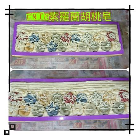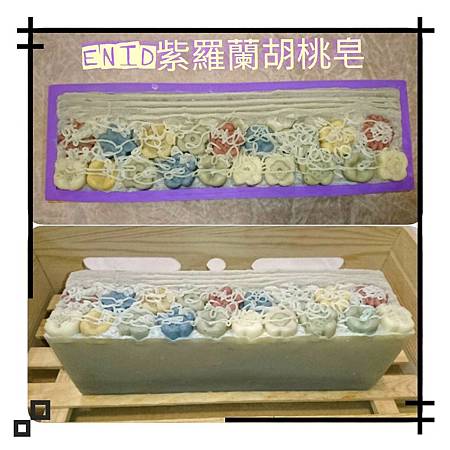 5.將皂液倒入矽膠模裡,放置到箱內保溫,因有點單調,所以表面有放了一些先前製作的小粒皂裝飾一下