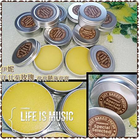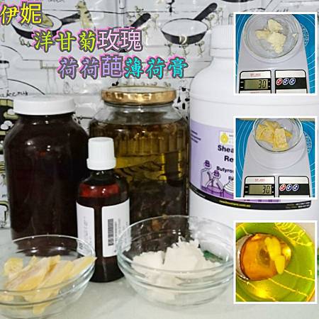 這膏使用了己浸泡10.7個月的洋甘菊甜杏仁浸泡油和6.2個月玫瑰初榨橄欖浸泡油,輔助一些功效,手作就是貪心,看得到的什麼都想放一點,洋甘菊有舒緩壓力和幫助睡眠的功效,當然洋甘菊還有止癢的功能,玫瑰有鎮靜抗憂鬱抗菌的作用,但伊妮主要是想要玫瑰它的香囉,甜甜的幸福感,玫瑰香百百種,都不太一樣,這次沒有放玫瑰精油就用玫瑰浸泡油來替代