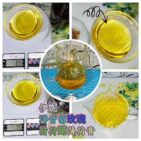2.準備洋甘菊甜杏仁浸泡油85g+玫瑰初榨橄欖浸泡油75g+黃金荷荷葩油3g,倒入融化的蜂蠟和乳油木果脂內,攪拌均勻,洋甘菊有一些細細的花蕊(箭頭處),但照片拍不太出來