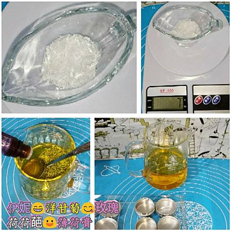 3.油脂全部攪勻後倒入薄荷腦7g,攪拌到薄荷腦融解,測量油溫約在60℃左右倒入精油混合均勻,即可準備倒入容器內