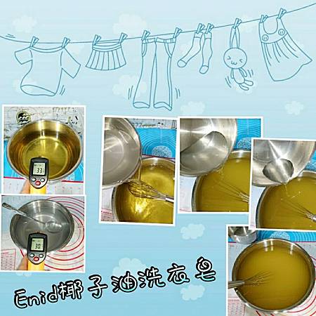 氫氧化鈉完全溶解後,量測油溫和鹼液的溫度約35℃左右且溫差5℃內,將鹼液慢慢的倒入油脂中混合均勻