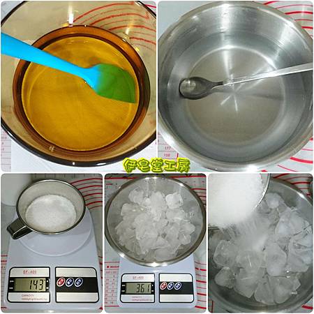 > 將苛性鈉143g分次倒入361g純水冰塊內,攪拌到苛性鈉完全溶解