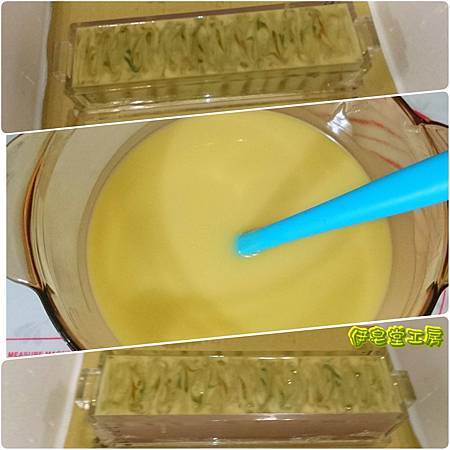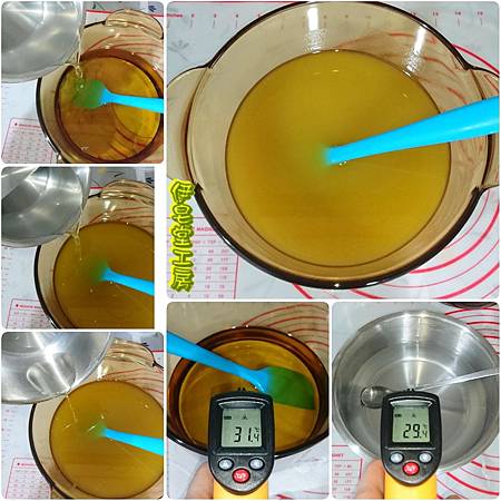苛性鈉完全溶解後,量測油溫和鹼液的溫度在35℃左右且兩者溫差5℃內鹼液慢慢的倒入油脂中混合均勻