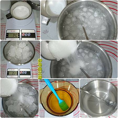 > 將苛性鈉140g分次倒入354g純水冰塊內,攪拌到苛性鈉完全溶解