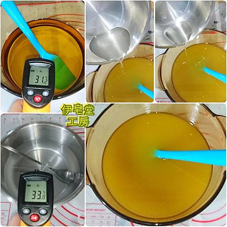 苛性鈉完全溶解後,量測油溫和鹼液的溫度在35℃左右且兩者溫差5℃內鹼液慢慢的倒入油脂中混合均勻