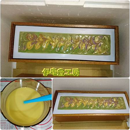 >另外分杯倒入植物粉及礦石泥粉後攪拌均勻再將皂液倒入模內放進箱內保溫