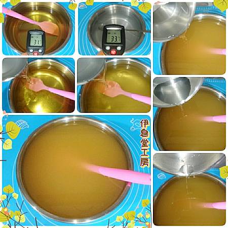 苛性鈉完全溶解後,量測油脂和鹼液的溫度在35℃左右且兩者溫差5℃內,將鹼液慢慢的倒入油脂中混合均勻
