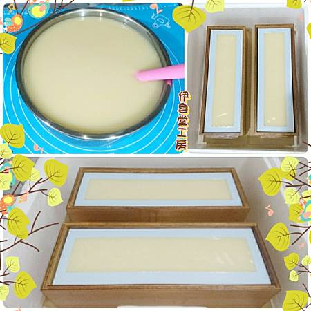 攪拌到可以畫出痕跡倒入檀香精油和喜馬拉雅雪松精油並與皂液混合均勻後,將皂液倒入模內