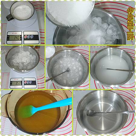 > 將苛性鈉140g分次倒入353g純水冰塊內,攪拌到苛性鈉完全溶解