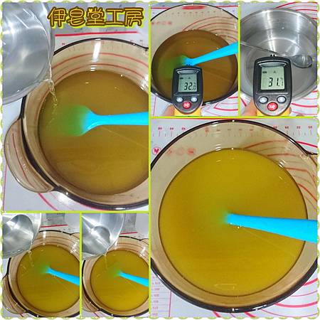 苛性鈉完全溶解後,量測油溫和鹼液的溫度在35℃左右且兩者溫差5℃內鹼液慢慢的倒入油脂中混合均勻