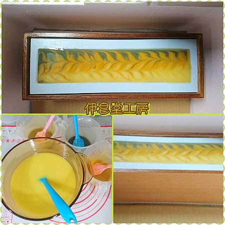 >另外分杯倒入礦石泥粉後攪拌均勻再將皂液倒入模內放進箱內保溫