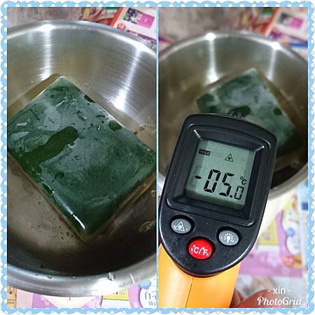 1.先把每種品項的油量測好倒入不鏽鋼鍋內混合,硬油要先隔水加熱溶解再混入,這是伊妮先前用慢磨機磨成汁拿去冷涷後的左手香冰塊,這...哈哈怎麼有點像菜瓜布