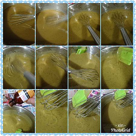 4.量測油溫和氫氧化鈉溶液的溫度,35℃左右混合然後開始攪拌,攪拌需要些時間,耐心打到略微濃到稠一直到可以畫出8即Trace後加入甜橙精油,這鍋邊/鍋底要用刮刀不時的刮一下,避免皂液沒打到